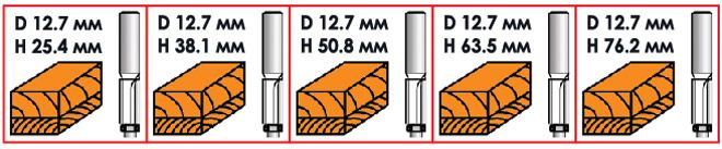 В наборі 5 фрез однакового діаметра, різної довжини: 25.4; 38.1; 50.8; 63.5; 76.2 мм. За рахунок того, що встановлена у фрезер фреза утворює з поверхнею опорного стола кут 90° , це дозволяє обробляти край заготовки строго перпендикулярно.